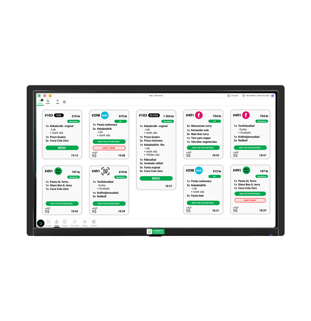 Inga fler papperslappar, ingen onödig stress. Med våra köksskärmar blir arbetet i köket både snabbare och mer strukturerat. Alla beställningar visas direkt i realtid på skärmen, vilket ger personalen en tydlig vy och full överblick över varje rätt – från order till servering.